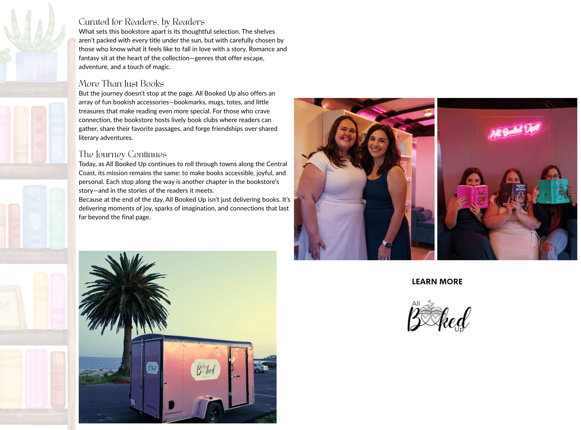 All Booked Up isn’t a traditional bookstore. It’s a vibrant, mobile bookshop that travels along the beautiful California Central Coast, popping up in neighborhoods, parks, markets, and community events. Instead of waiting for readers to come to them, All Booked Up brings the stories directly to where people live, work, and gather.