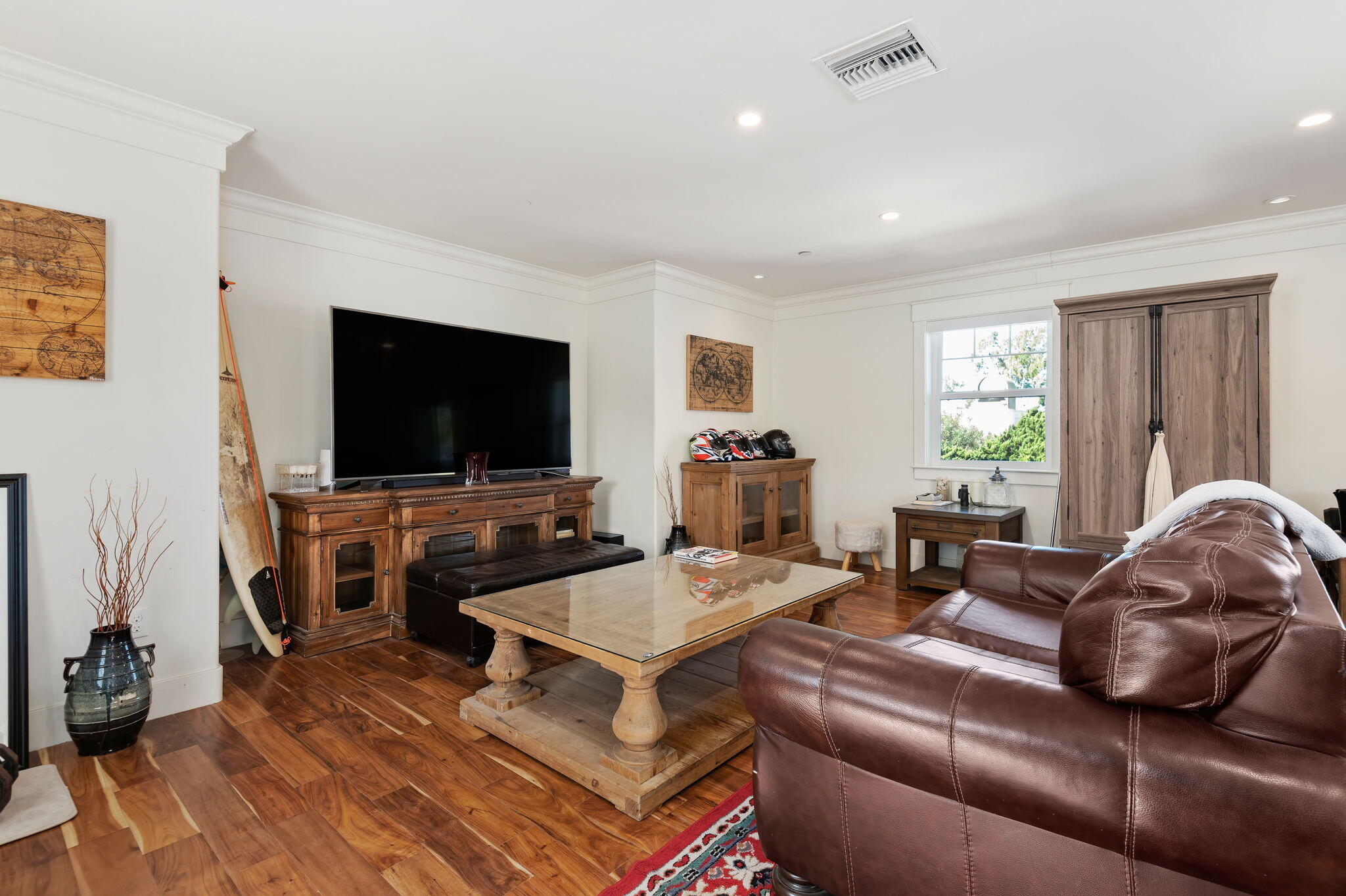Experience both comfort and sophistication at this remarkable Carpinteria residence, where stunning mountain views await. Inside, an open floor plan boasts wood and tile flooring, luxurious tiles adorn the kitchen and bathrooms, while vaulted ceilings and chandeliers add to the ambiance. The ground floor features a master suite, three bedrooms, two full bathrooms, and an office space. Upstairs, a versatile living space offers a full bathroom, private balcony, and separate entrance. Enjoy close proximity to downtown, with its array of shops, restaurants, beaches, and parks. Enjoy your outdoor oasis, complete with a commercial pizza oven, covered patio, putting green, and lush landscaping.Additional features include tankless hot water, solar panels, and central heating/ac.